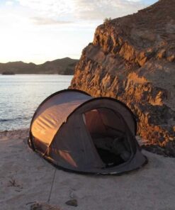 Das Zelt für zwei Personen lasst sich super schnell aufbauen : Einfach das Zelt in die Luft werfen undzusehen, wie es sich selbst aufbaut. Einfach mit Heringen sichern. Fertig. Lässtsichauch schnell wieder zusammenfalten und ist dann flach wie ein Pfannkuchen.
